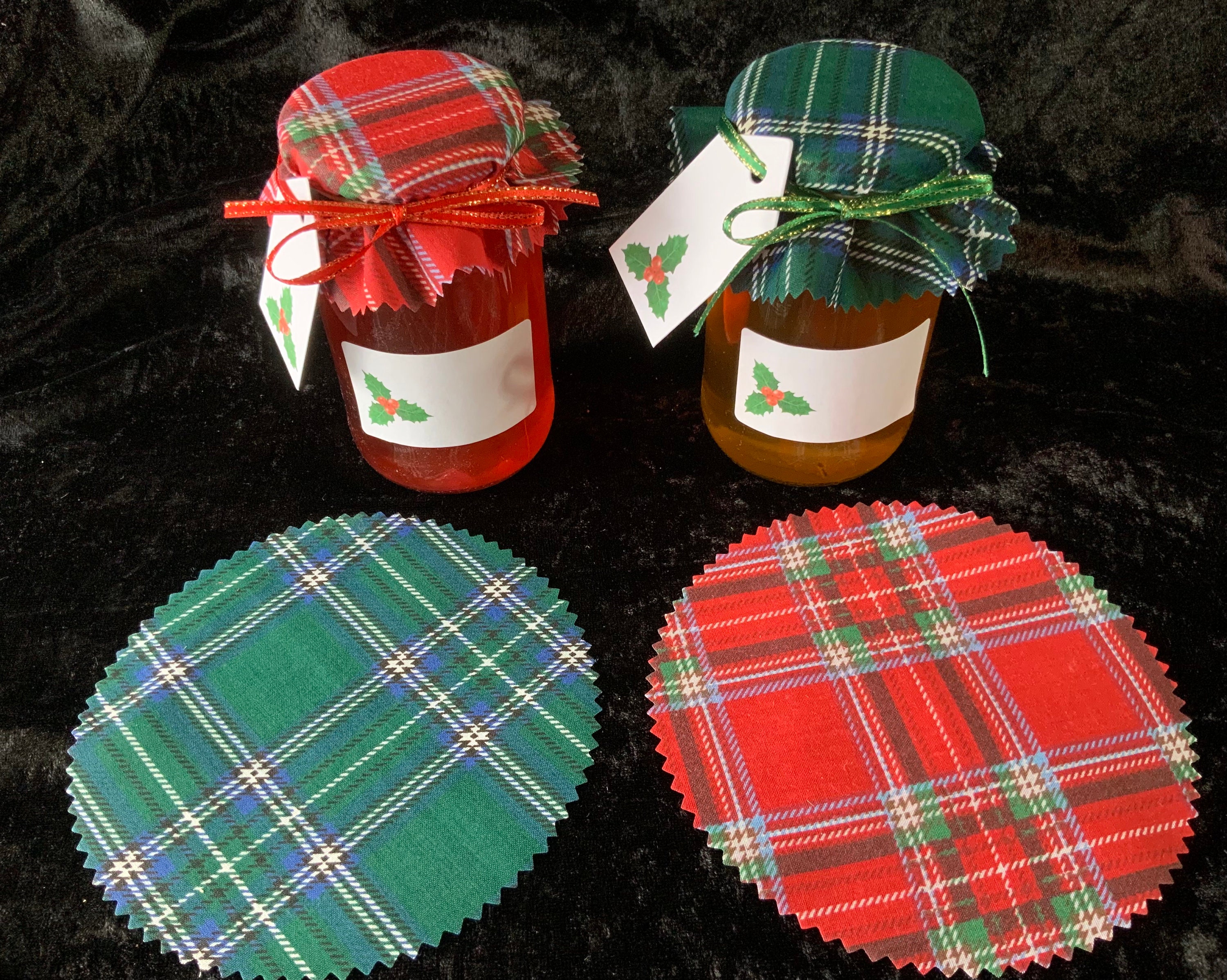 10 Christmas Holly Jam Pot Covers and Labels - Amazon x 50 Red Christmas Patchwork Squares - 4″ X 4″ (10cm) 75 1 offer from £3.99 Tala Decorative Preserve Covers, Cream/ Red 86 1 offer from £4.99 Fabric jam jar covers GINGHAM mixed x 36 12 1 offer from £15.99 KitchenCraft Home Made Jam Jar Covers with Fastening Bands and Ribbon, Hearts and Flowers Pattern, Paper, Assorted Colours, 24 Pieces 129
